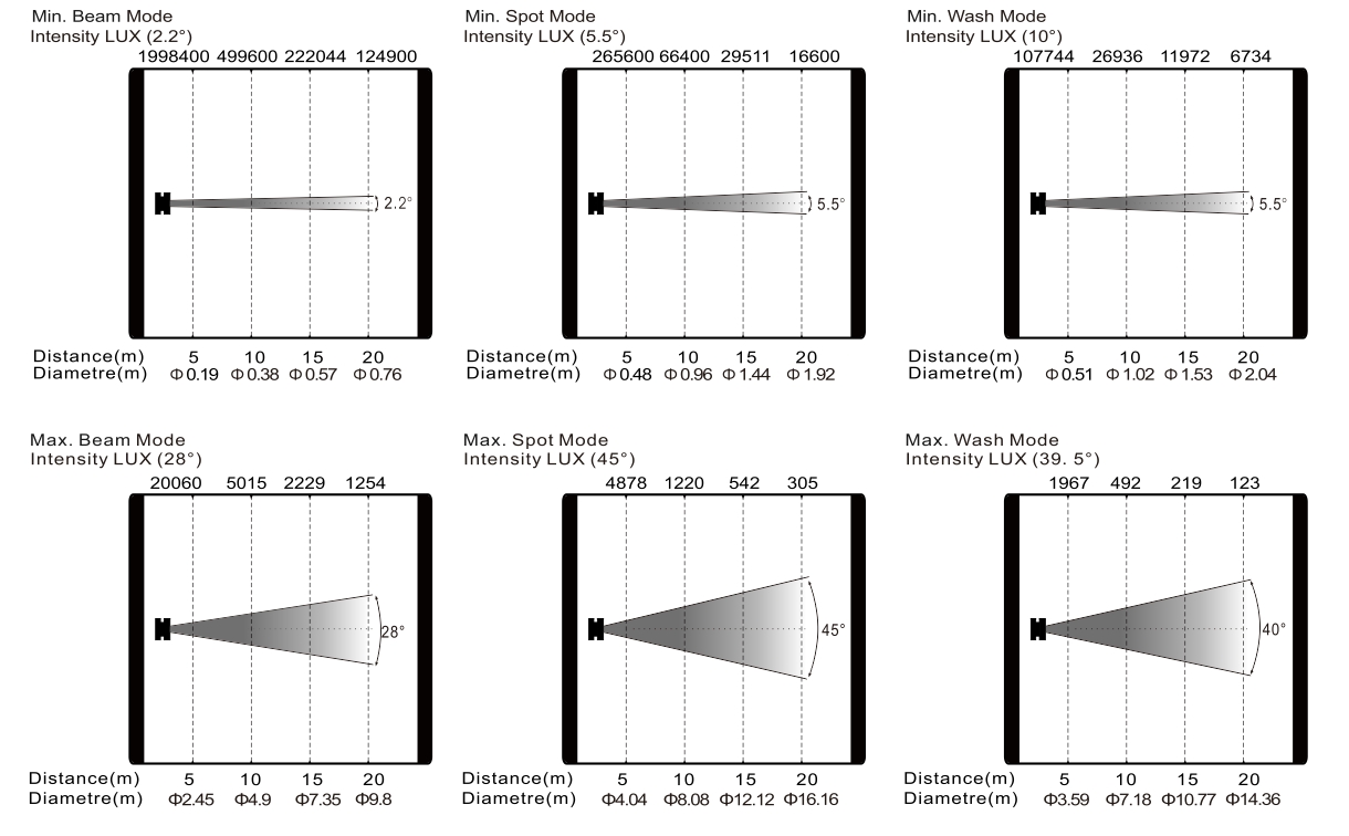 變焦范圍:光束模式: 2.2°- 28°,圖案模式: 5.5°- 45°,染色模式: 10°-40°